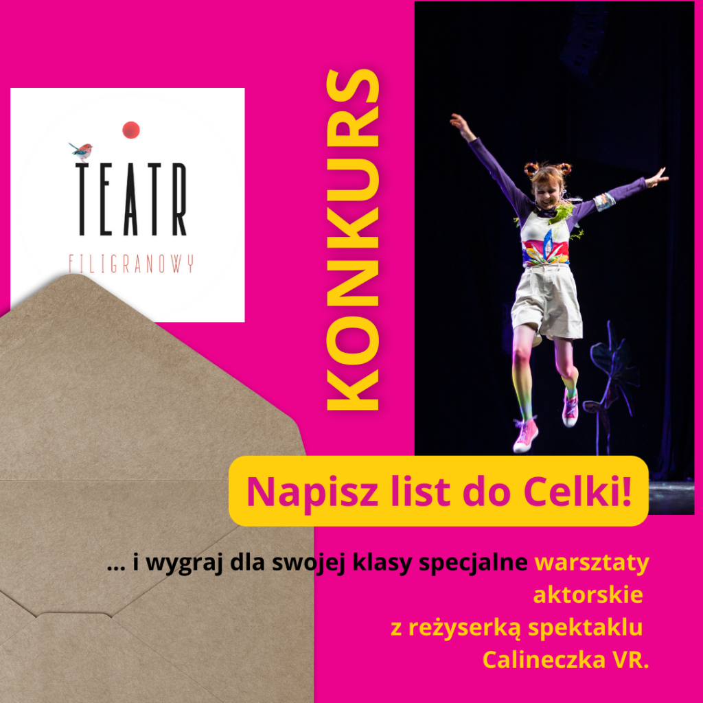 8. Nagroda: Autorka lub autor wybranego listu otrzyma możliwość zorganizowania warsztatów aktorskich w swojej szkole, które poprowadzi reżyserka spektaklu „CALINECZKA VR” – aktorka Joanna Świtała. Warsztaty odbędą się w terminie ustalonym wspólnie przez Teatr Filigranowy i zwycięską szkołę, jednak nie później niż do dnia 31 maja 2025 roku.